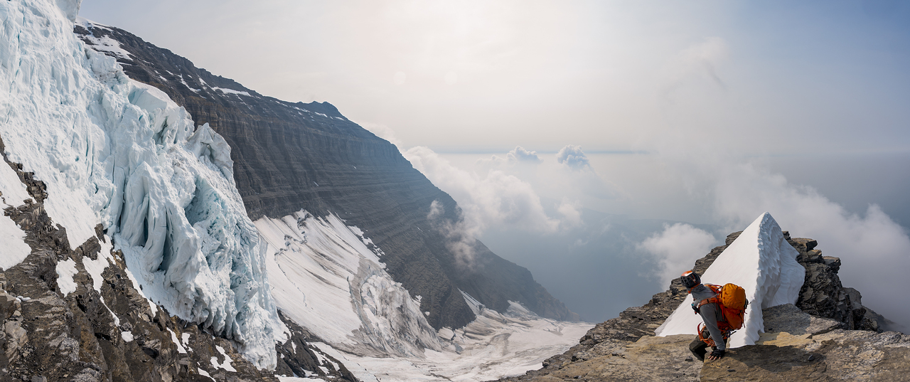 Above: We're through the ledges, out from underneath the glacier's line of fire and on the last ridge we'll ascend all the way to the summit. The title shot's "Gargoyle" and long fin (frame right in that same shot) are visible in the center and lower-right of this shot (respectively). Limiting vertical movement to the nose's ridge nixes overhead hazard, and several viable options are visible from this angle. Spot your route all the way to the next nose or safe spot before walking ledges exposed to overhead hazard. Make sure it's quiet. Then move. Not so bad! (with caveats. Scroll up for those 😁)