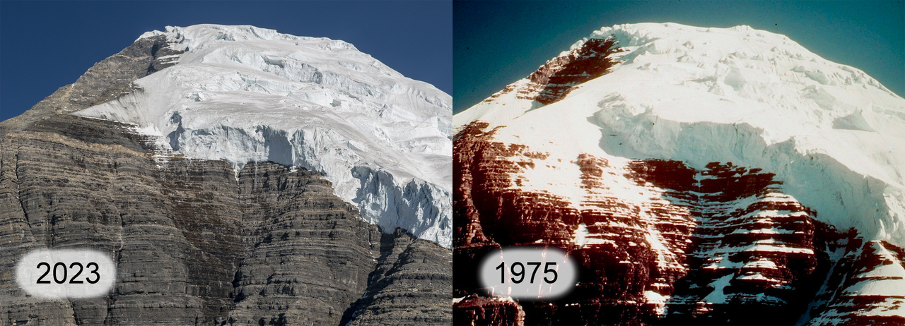 Above: Comparison snaps of the glacier across five decades. The ledges in the 1975 shot (right) were snapped mid-winter and have more snow below the glacier, where the 2023 shot was snapped during a summer heat dome.