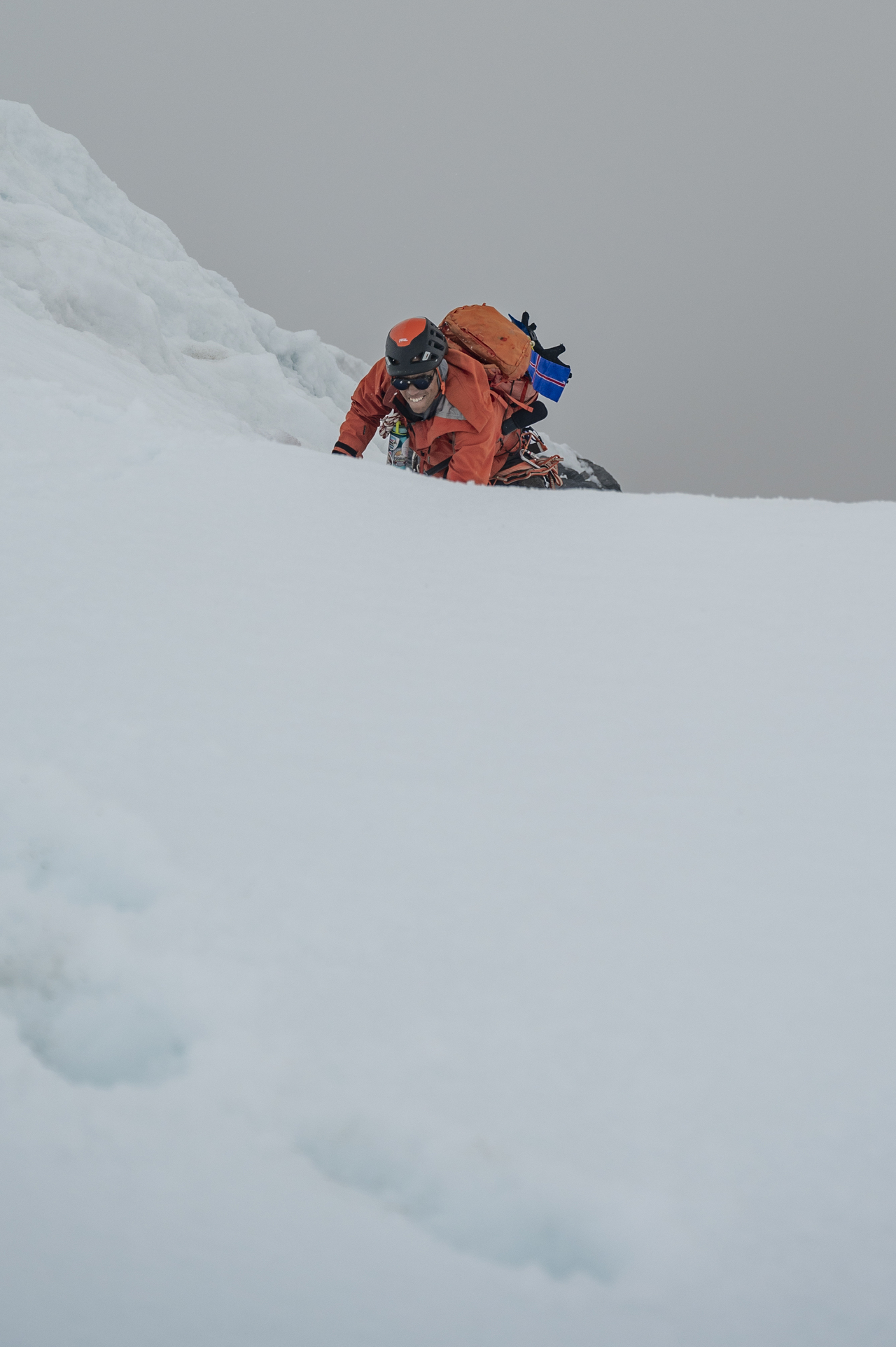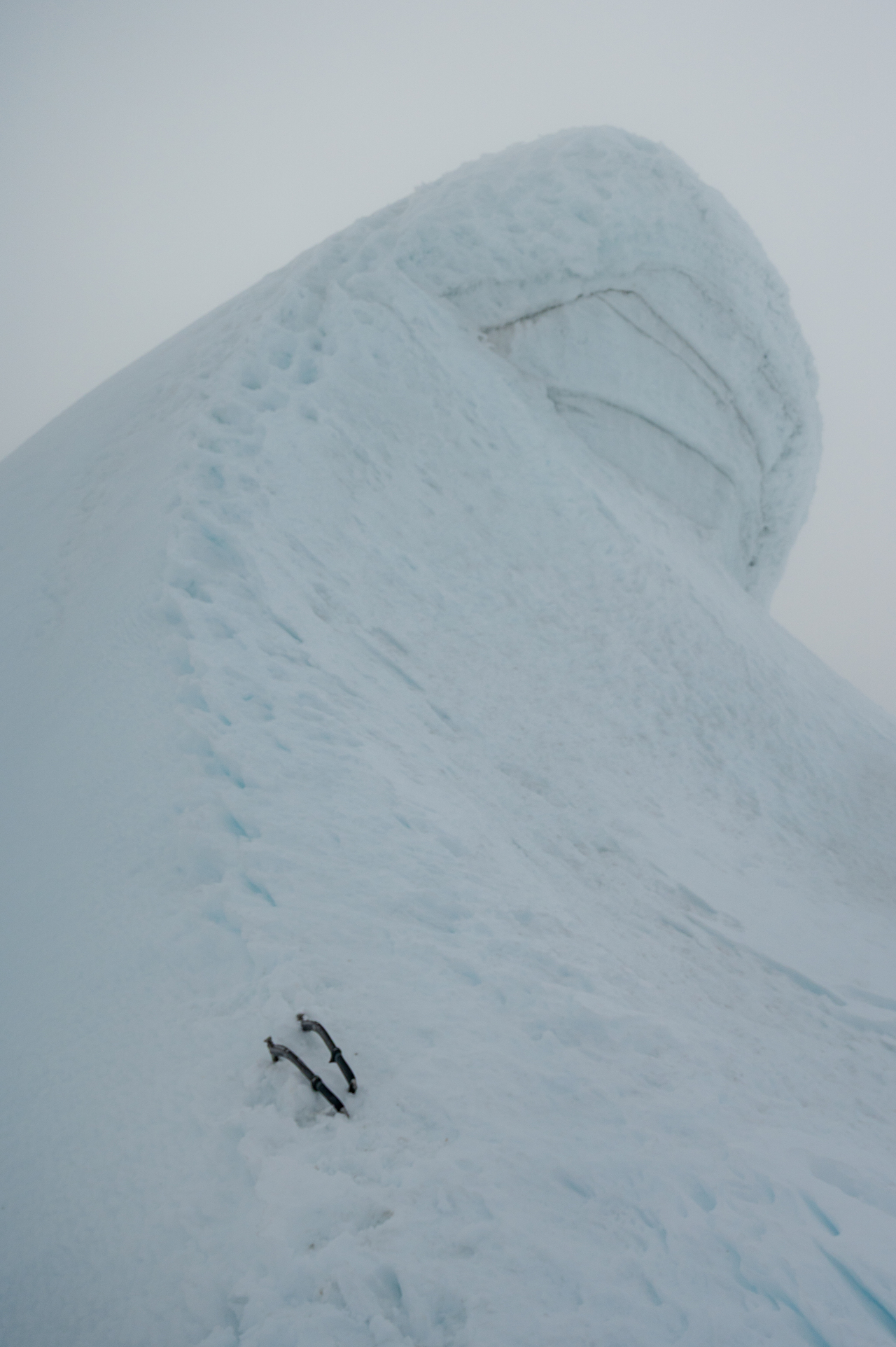 Also tough to see from this shot: a few times we’d drifted right onto the face for easier terrain to where it looked like we would need to crampon and rope up for glacier movement. Yet each time, returning left landed us on a solid rock ledge we hadn't been able to see from our position, often right at the edge of the ridge’s precipitous west face. We didn’t crampon up until gaining the glacier at the summit, maybe thirty meters of a 50’ firn wall.