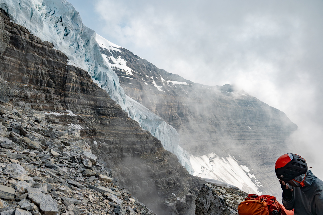 If you’re up here (right) you’re higher than you need to be. The glacier is just a few meters behind this shot. Safer ledge options further down buy time in case of a collapse, affording at least some protection we don’t have this close to the notorious wall of ice looming overhead and running the length of this section of the Schwartz Ledges.