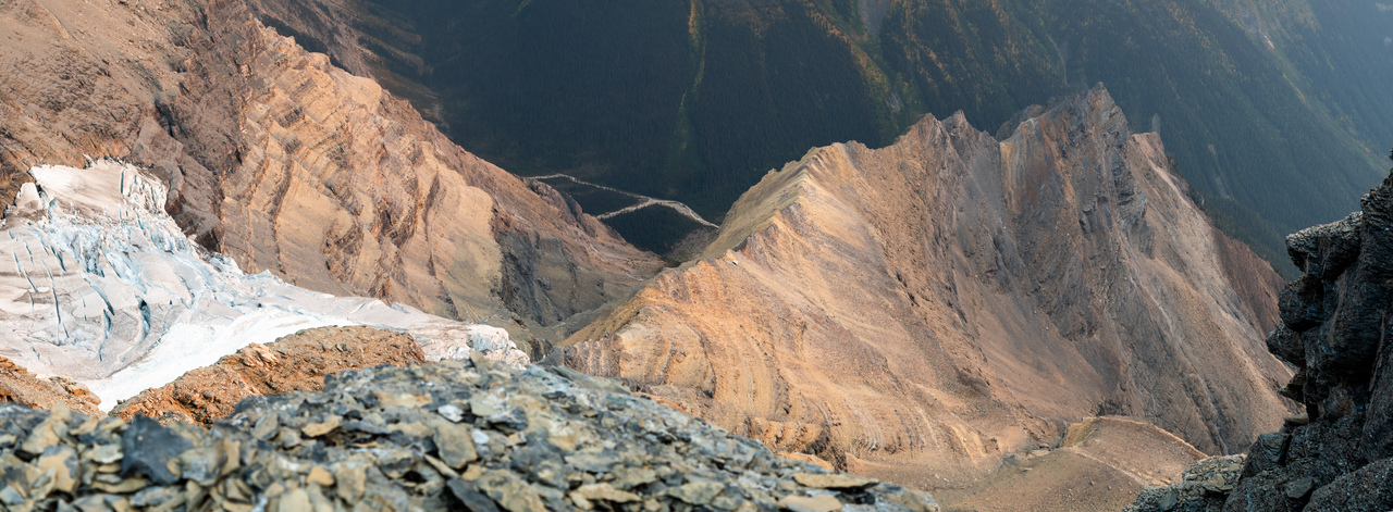 I'd hoped that five decades of shrinkage (1975 on the right5) would have made this section more safe. Recent (2023+) snaps of North Twin's ridge descending to its col with Twins Tower, snaps of the Lower Victoria glacier below Abbot Pass, snaps of the Kain Face, and of course snaps the Athabasca Glacier all show visibly significant retreat in comparison to snaps from even a decade before.