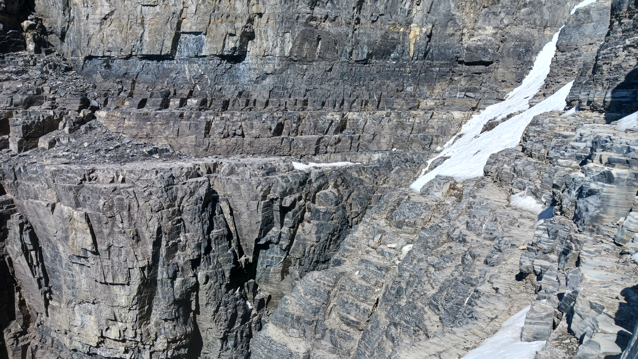 My risk is worse in a couloir with the ice sheet pushing out past its supporting rock up top. The rock wall (right) frame right gains protective overhang as it moves out of the frame until I’m enough on the ridge that any ice &/or rockfall will want to shed away from the ridge’s centerline (& away from your scrambling scribbler!). I only move up when I’m near a centerline and DO NOT MOVE AT ALL until (1) I can spot a set of big, fat, juicy ledges (see the last two shots) that are an easy walk 👉 ALL THE WAY 👈 to the next protective feature, and (2) it’s dead quiet. There is overhead hazard we can't see. No noise means it's unlikely something's already crashing my way.