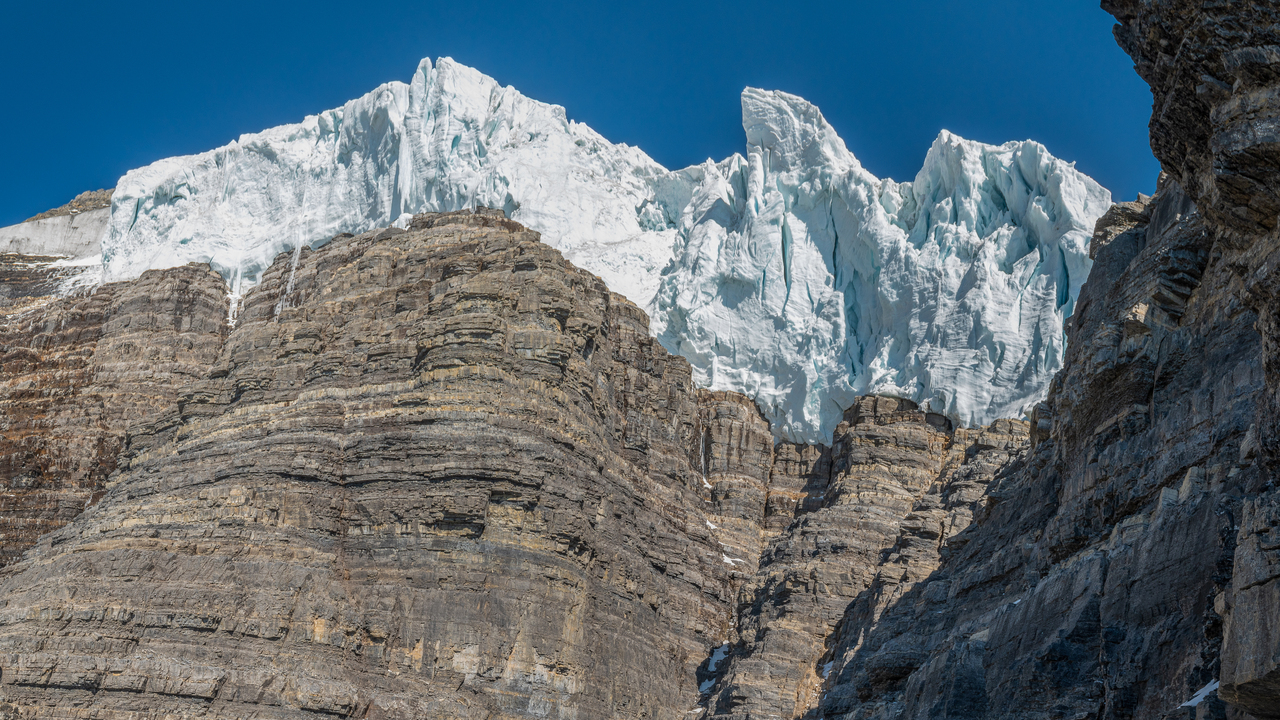 Above: A local park warden referred to the figures looming overhead in the broken ice sheet here as “Gargoyles”, though I more typically see the term for ice formations formed by different process up top Robson’s summit. Either way — and unlike their counterparts in Gothic Architecture for which they’re named — their menace is real here.