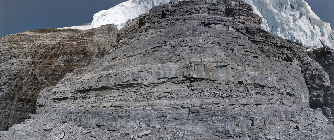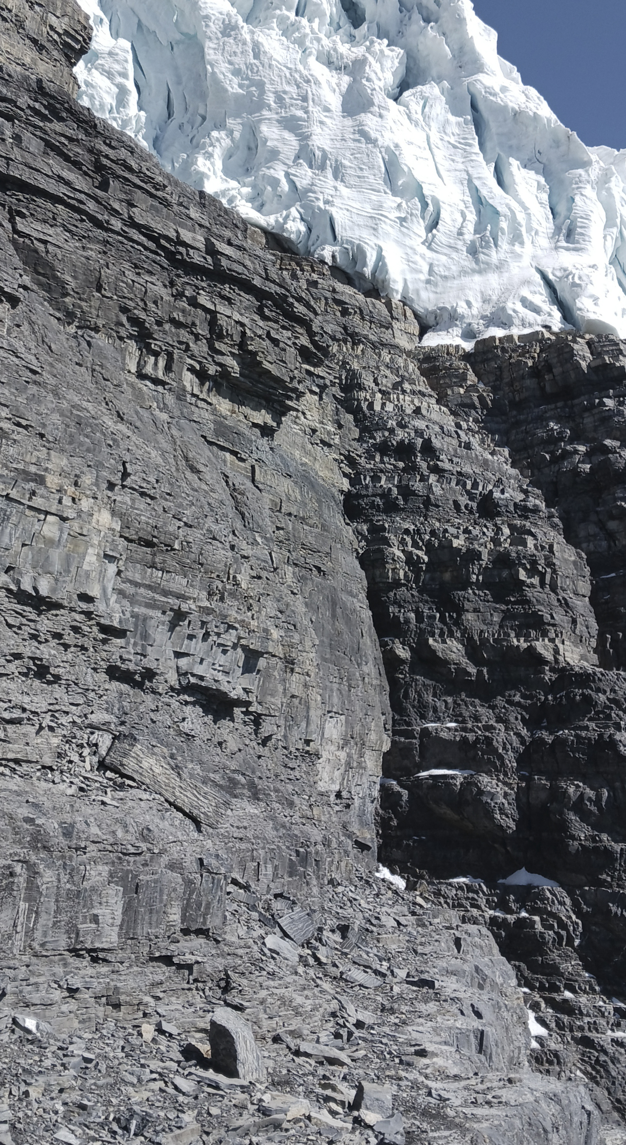A cellphone-snap from a set of ledges further down from this page’s title snap and from an earlier trip (2023). Being further down from the overhanging glacier and moving carefully between rock features that offer overhead protection dials back the risk associated with moving through here.