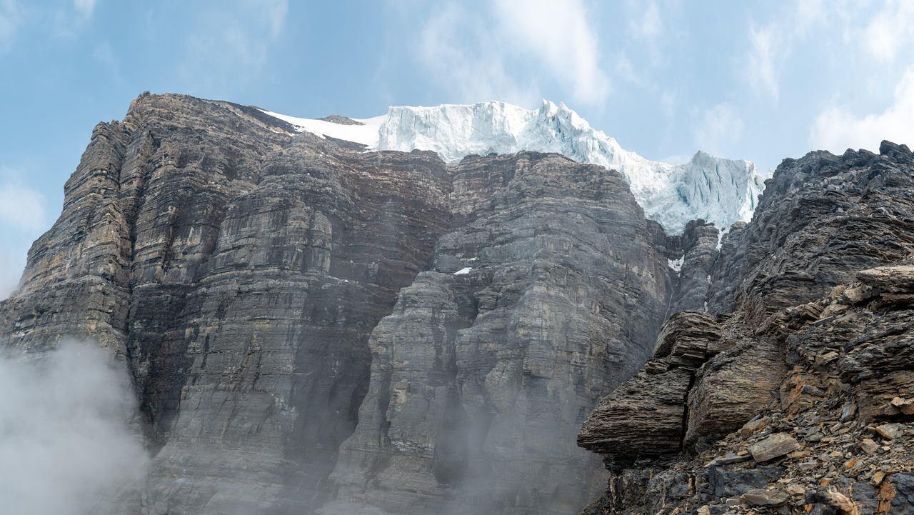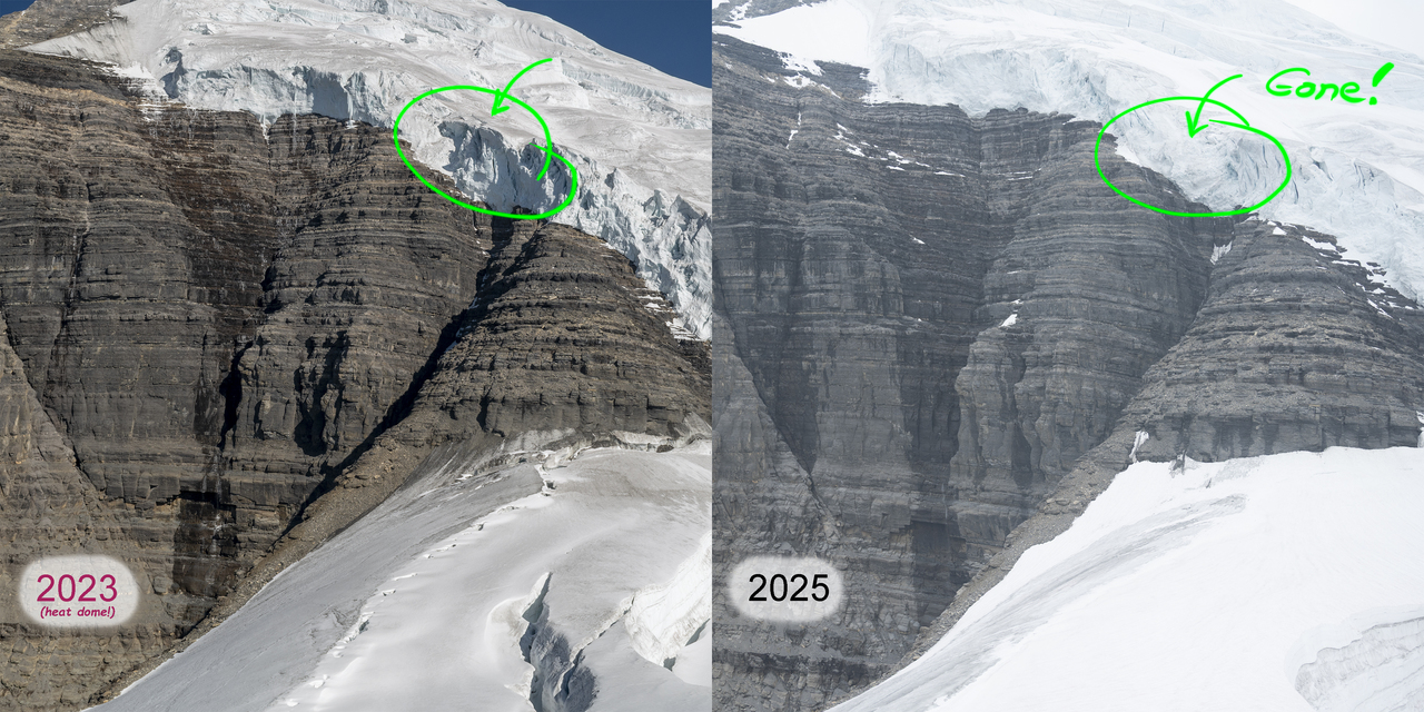 Another concern: a large section of ice looming over the right gully in the 2023 shot is absent in 2025. In the best case, the ice that crashed down the gully would have been limited to what disappears over the gully between the two shots. Yet the shots are two years apart and glacial movement4 likely shoved more ice into that gully than what we see here.