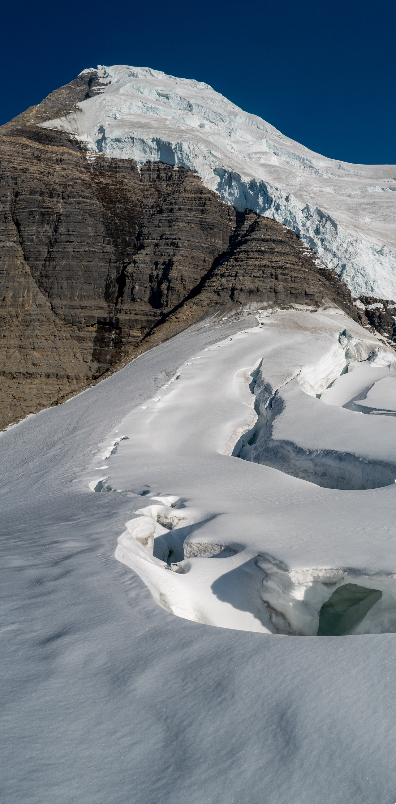 Above: A look at Robson’s upper glacier from near Little Robson’s summit, not far from where we step on the glacial ramp to gain the saddle.