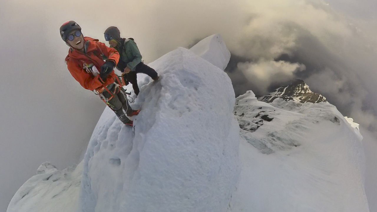 Below: I snapped Leo in this chimney just a few dozen meters from Robson's summit. We literally climbed out of a cloud here. Quite the experience! I hope this shot captures some of that.