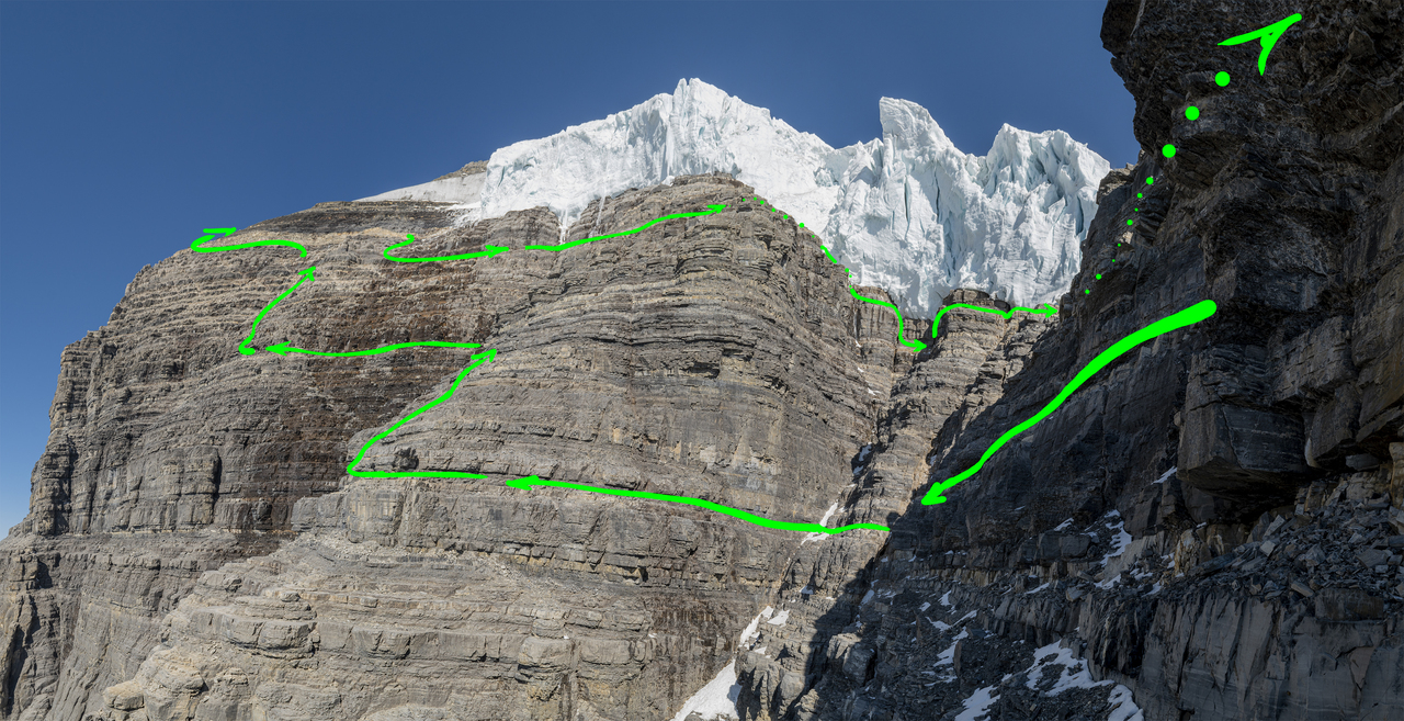 Above: The view of the ledges (2025) from just a few vertical meters above Little Robson’s glaciated saddle. We see more of the third-class ridge we’ll ascend on the right to gain the ledges in this shot. There is no overhead hazard until we move into the couloir. The title shot's "Gargoyle" is up there on the right.