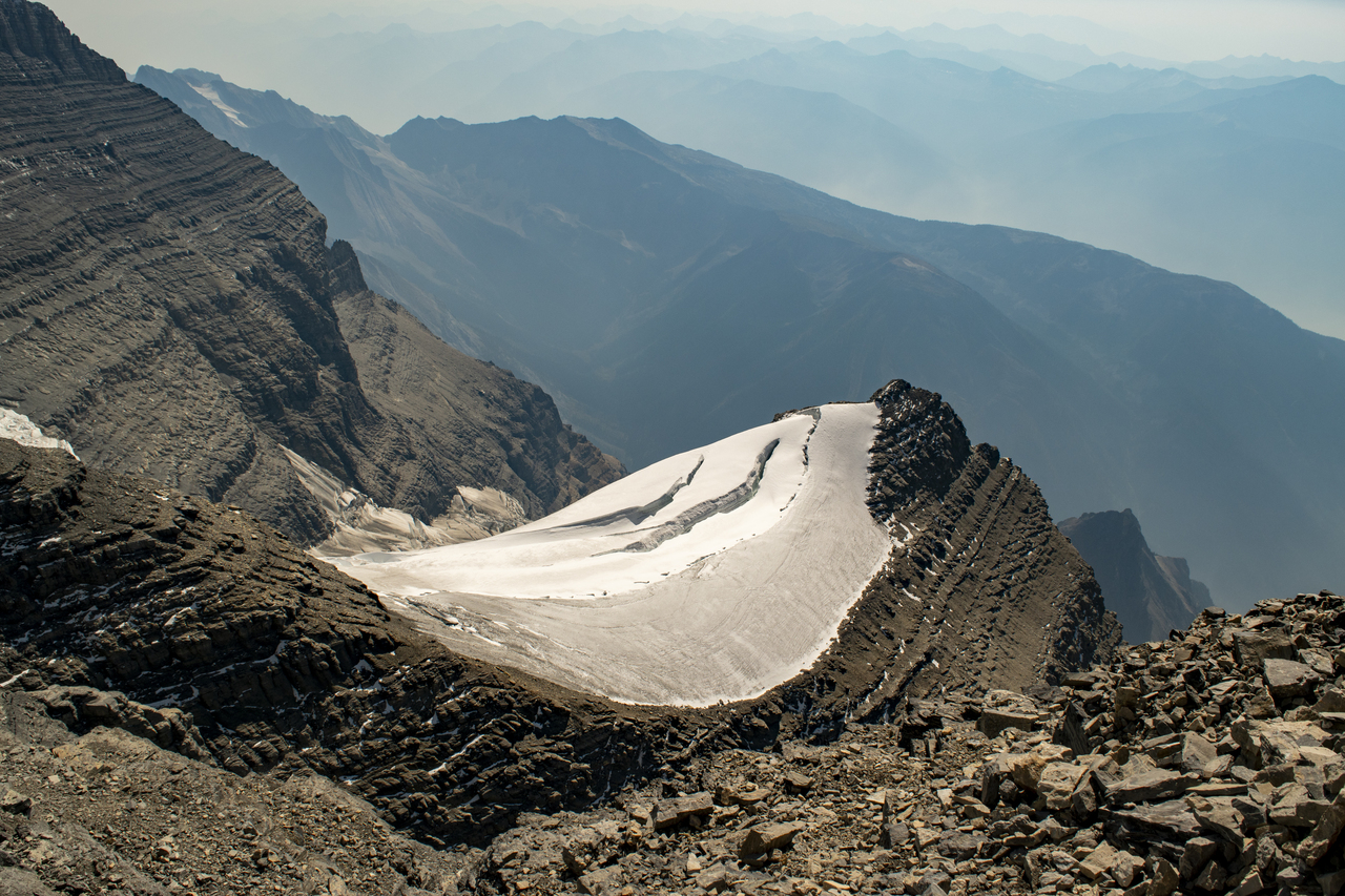Above: A look back towards Baby Robson and the hut from further up the first cliffbands above the hut. The hut’s roof and the last shot’s ice collapse are (just) visible along the ridge below the glacier. Snapped during the 2023 heat dome, smoke from nearby wildfires was terrible.