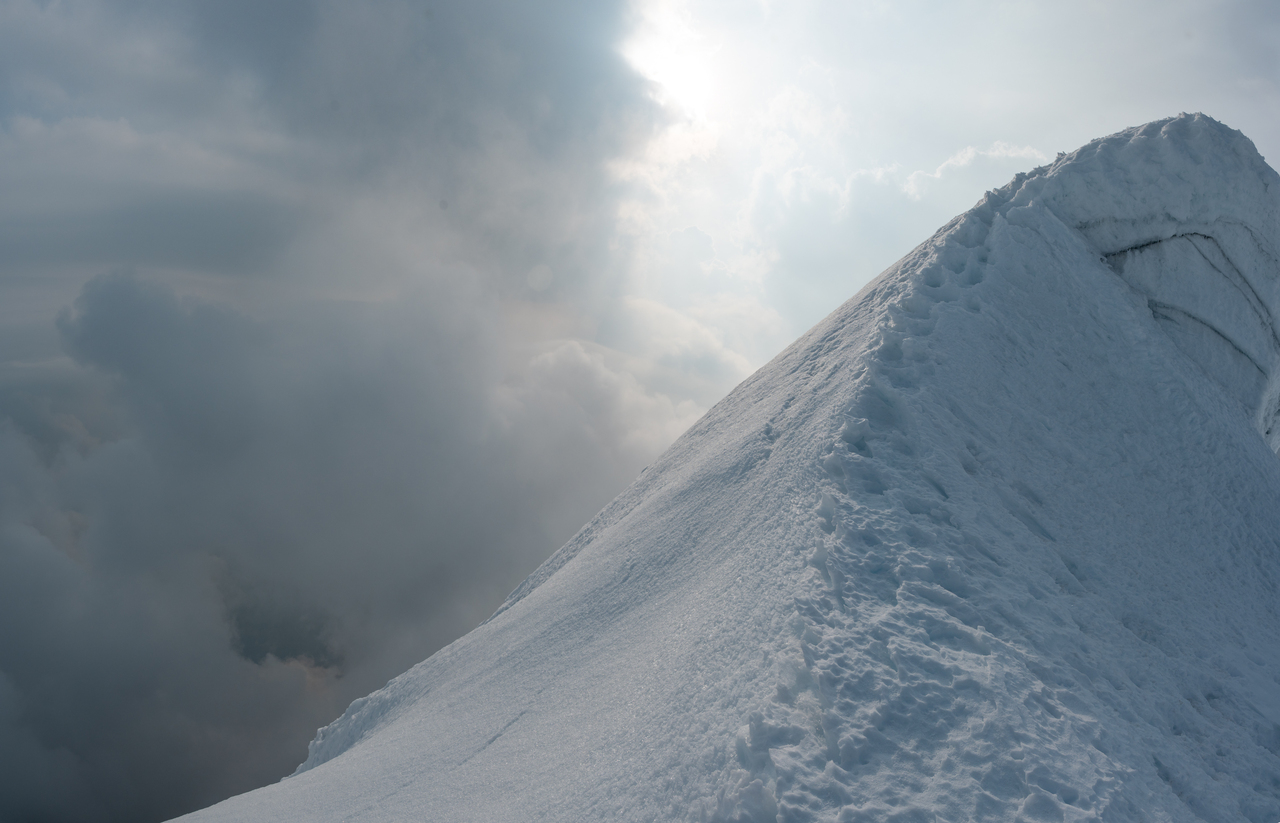 Above: After a few minutes, the clouds cleared just enough for this artsy gargoyle shot. Robson's summit is up on the right, just a few meters ahead. The tracks show that at least one other party has been up here recently.